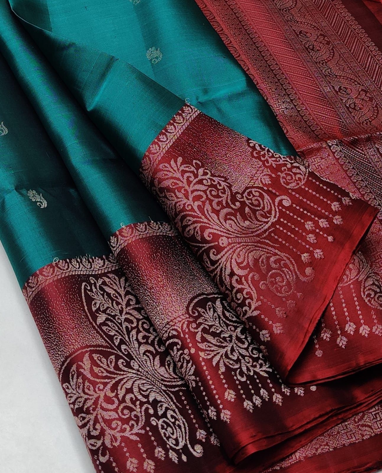 A Teal and Maroon silk saree is a traditional Indian garment known for its luxurious fabric, rich texture, and elegant drape. Made from silk, a natural fiber, these sarees are a symbol of grace and are often worn for special occasions like weddings and festivals.