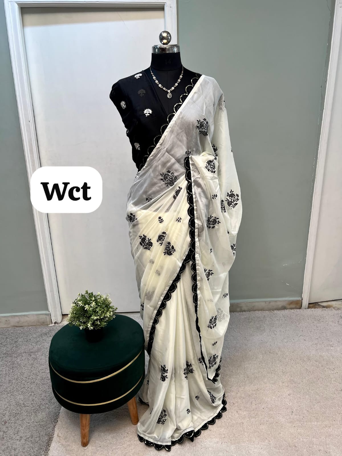 Elegant white saree with delicate black floral embroidery and a scalloped black border, paired with a contrasting black blouse. A classy and graceful choice, perfect for festive and special occasions.