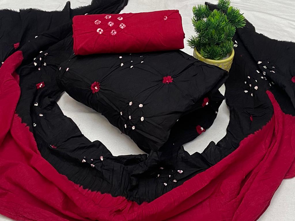 Elegant Bandhani cotton salwar suit in with accents and delicate white tie-dye motifs, offering a graceful, comfortable, and traditional look suitable for daily wear and festive occasions.
