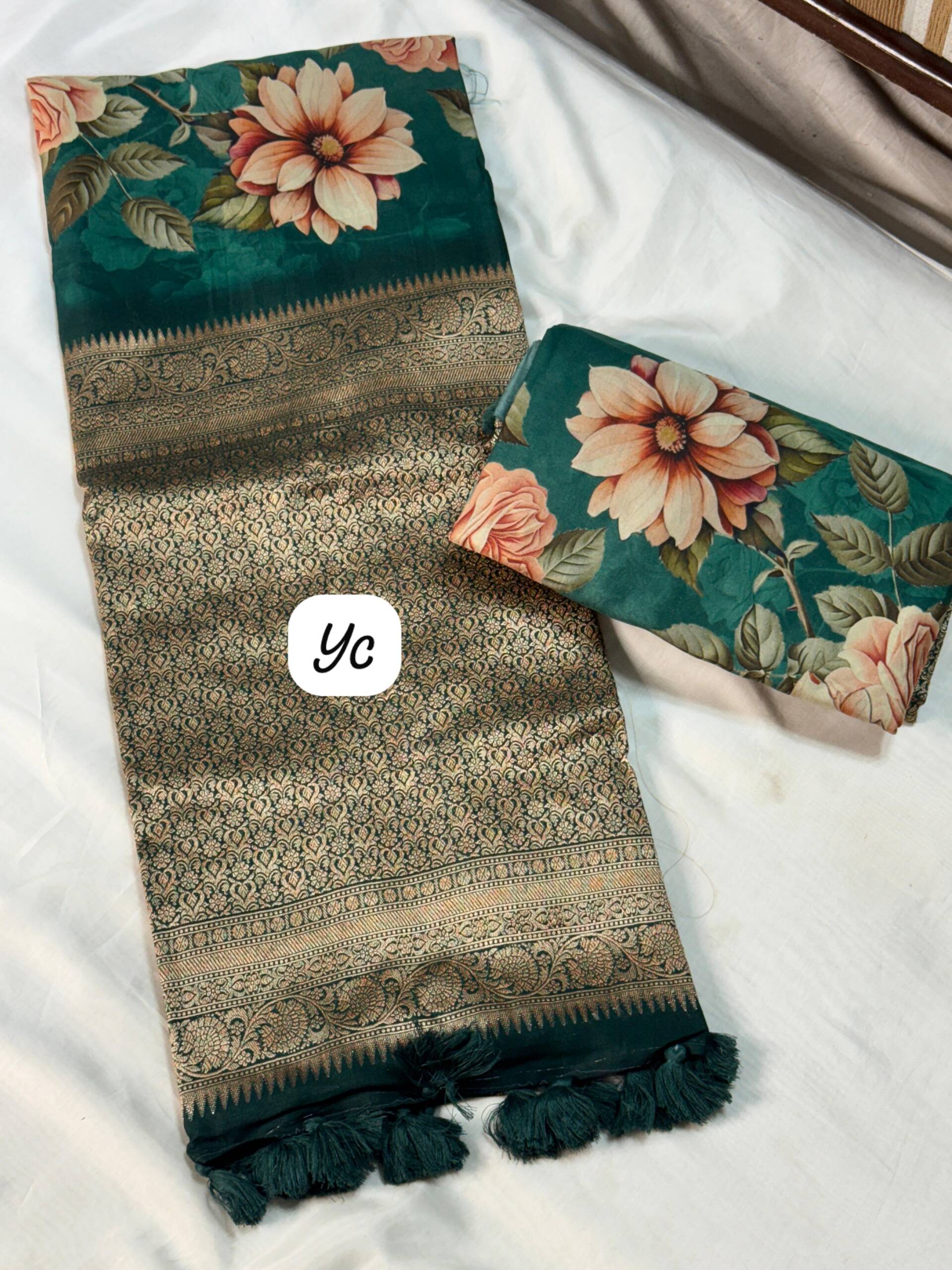 A rich teal saree adorned with elegant floral prints and intricate antique-gold woven borders, finished with soft tassels. Graceful and timeless, perfect for festive occasions and elegant gatherings.