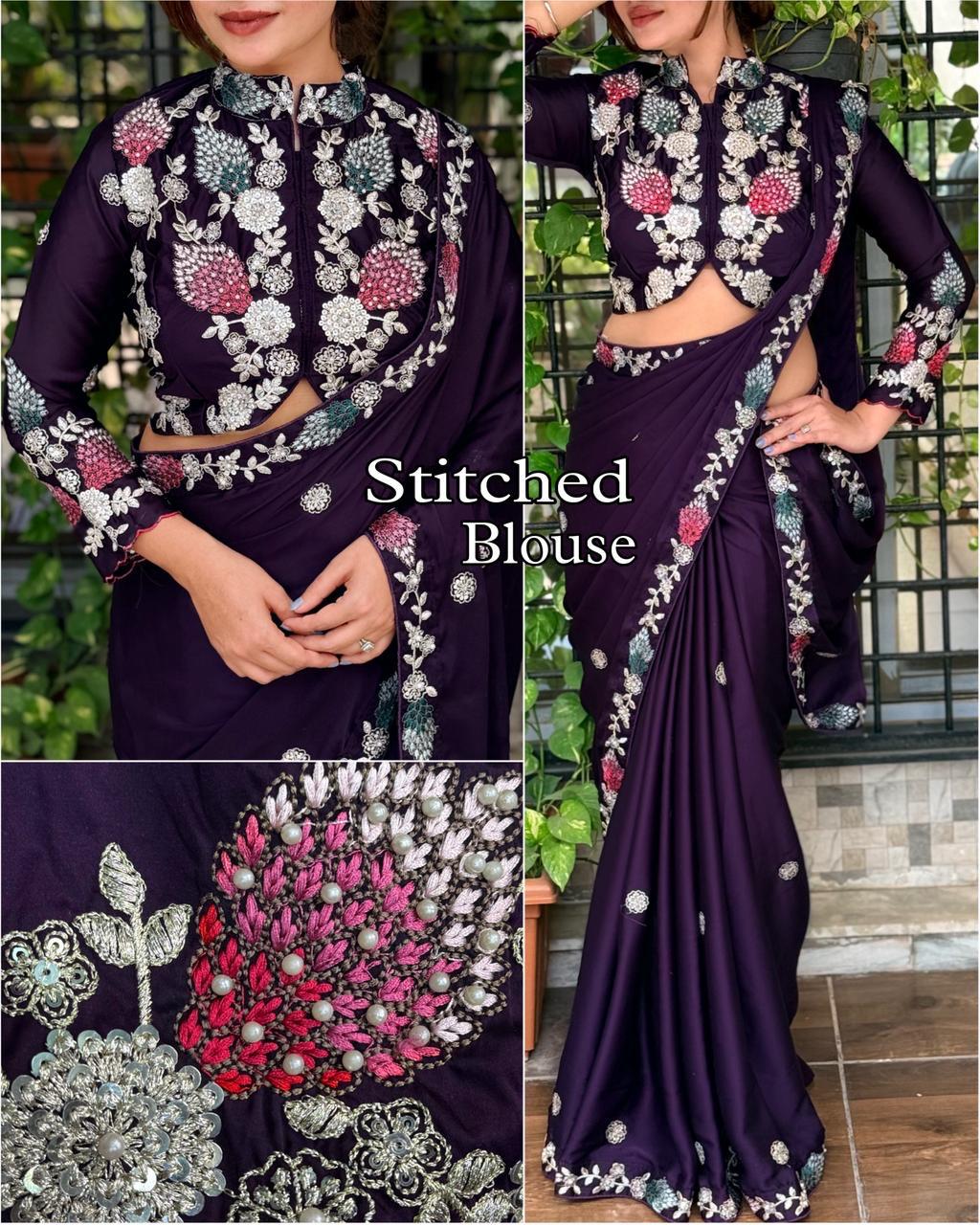 The saree is a bright shade with elegant silver floral embroidery and delicate pearl detailing. It features a heavily embroidered high-neck stitched blouse and a matching embroidered border, giving it a rich, festive, and graceful look.