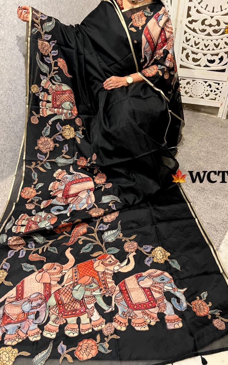 Elegant black saree featuring rich Kalamkari-style elephant and floral motifs in earthy tones, finished with a subtle gold zari border. A graceful blend of traditional art and contemporary elegance, perfect for festive and cultural occasions.