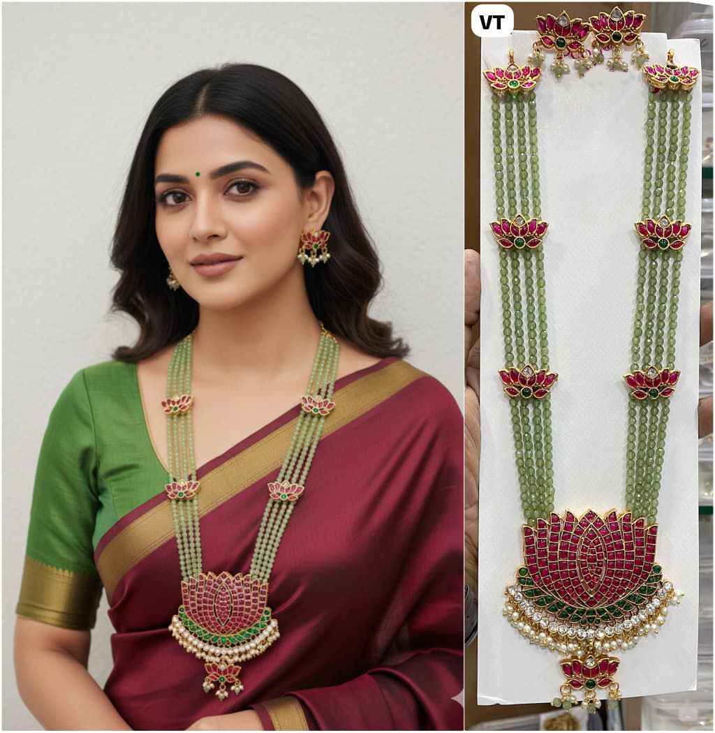 An elegant traditional jewelry set featuring a long multi-strand green beaded necklace with lotus-inspired ruby and green stone motifs, finished with a grand pendant accented by pearls.