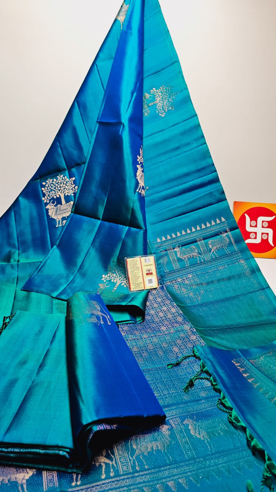 Elegant turquoise–blue silk saree featuring intricate silver zari weaving with traditional motifs.