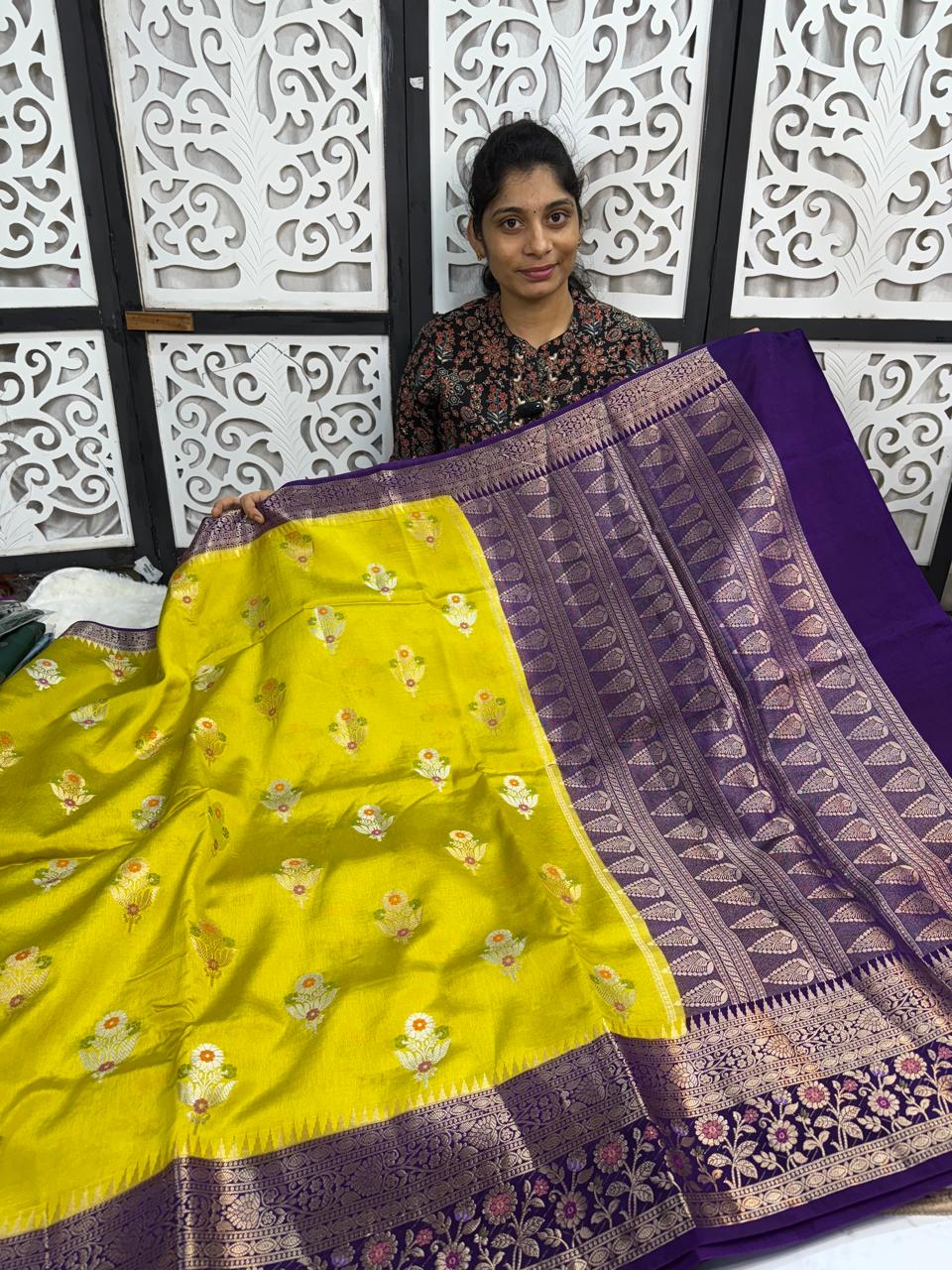 Bright mango yellow silk saree with delicate floral buttas, paired with a rich royal purple zari woven border and grand pallu. A vibrant and elegant choice for festive and traditional occasions.