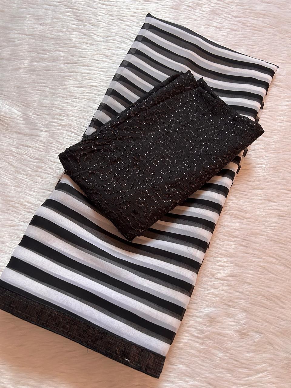 Elegant black-and-white saree featuring bold horizontal stripes paired with a textured black blouse fabric, giving a modern, classy look with subtle sparkle.