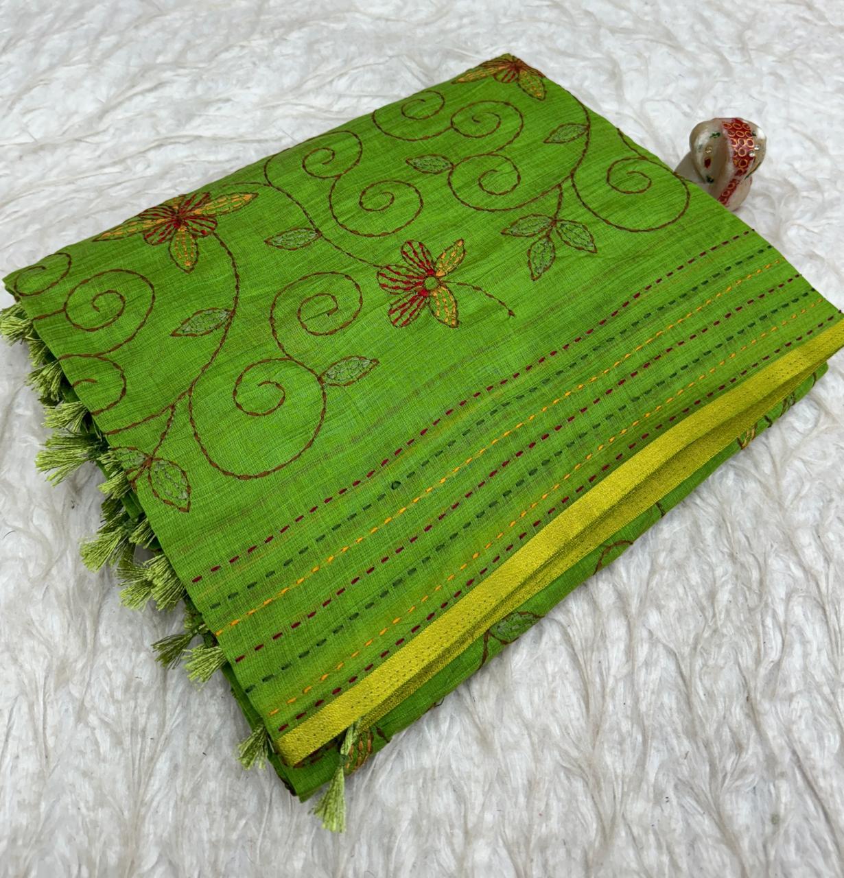 A saree adorned with delicate vine and floral embroidery, finished with a mustard-gold border and hand-stitched detailing, offering a warm, earthy, and elegant appeal.