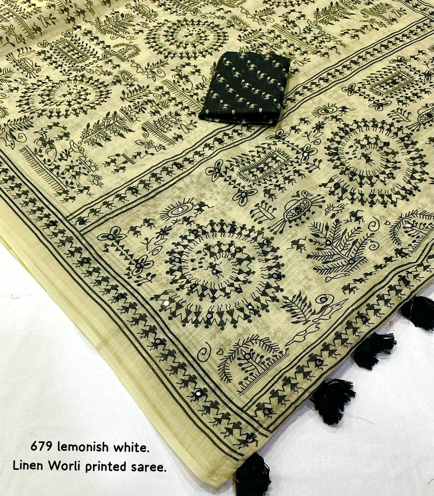 Lemonish white linen saree featuring elegant black Warli prints, detailed borders, subtle mirror accents, and finished with black tassels for a classy ethnic look.