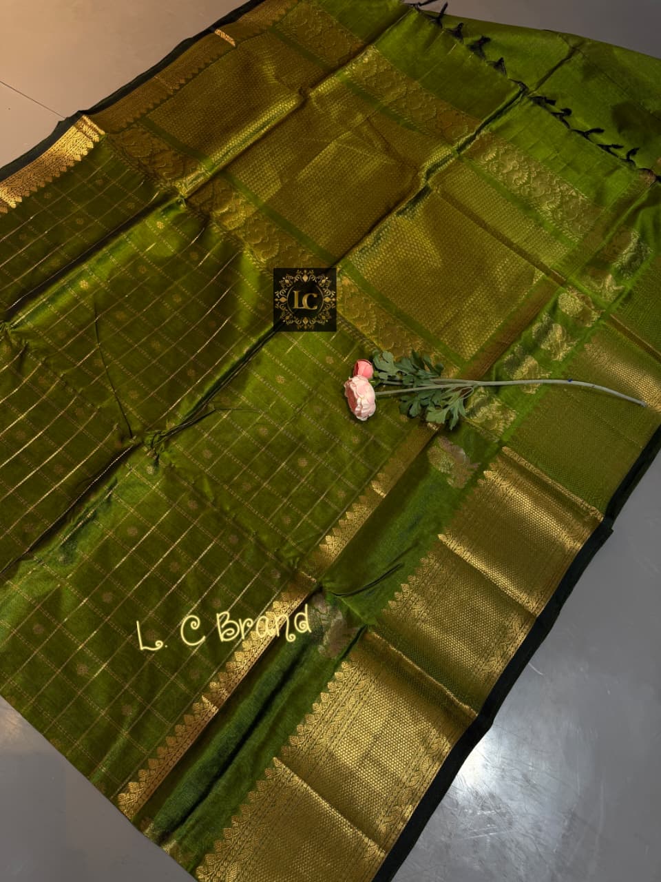 Elegant green pattu silk saree featuring rich golden zari checks and a broad traditional border, finished with a subtle sheen for a timeless, festive look.