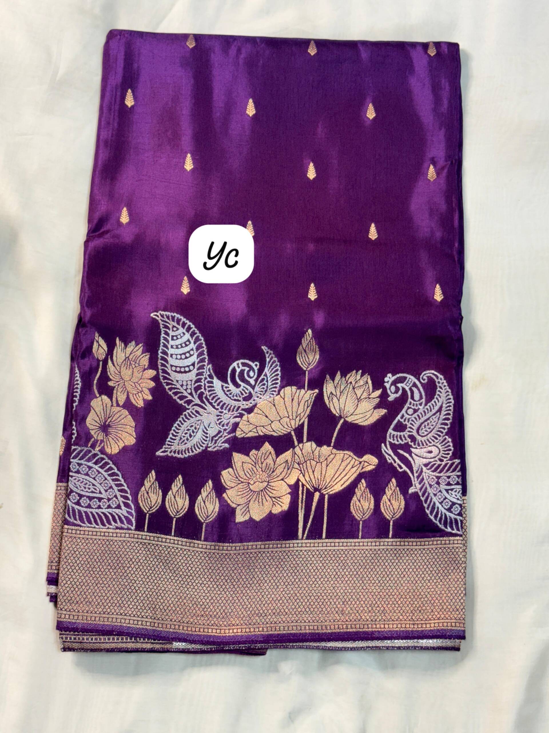Elegant deep purple saree adorned with delicate gold butti motifs and a richly woven border featuring graceful lotus and peacock designs, giving it a regal and traditional charm.