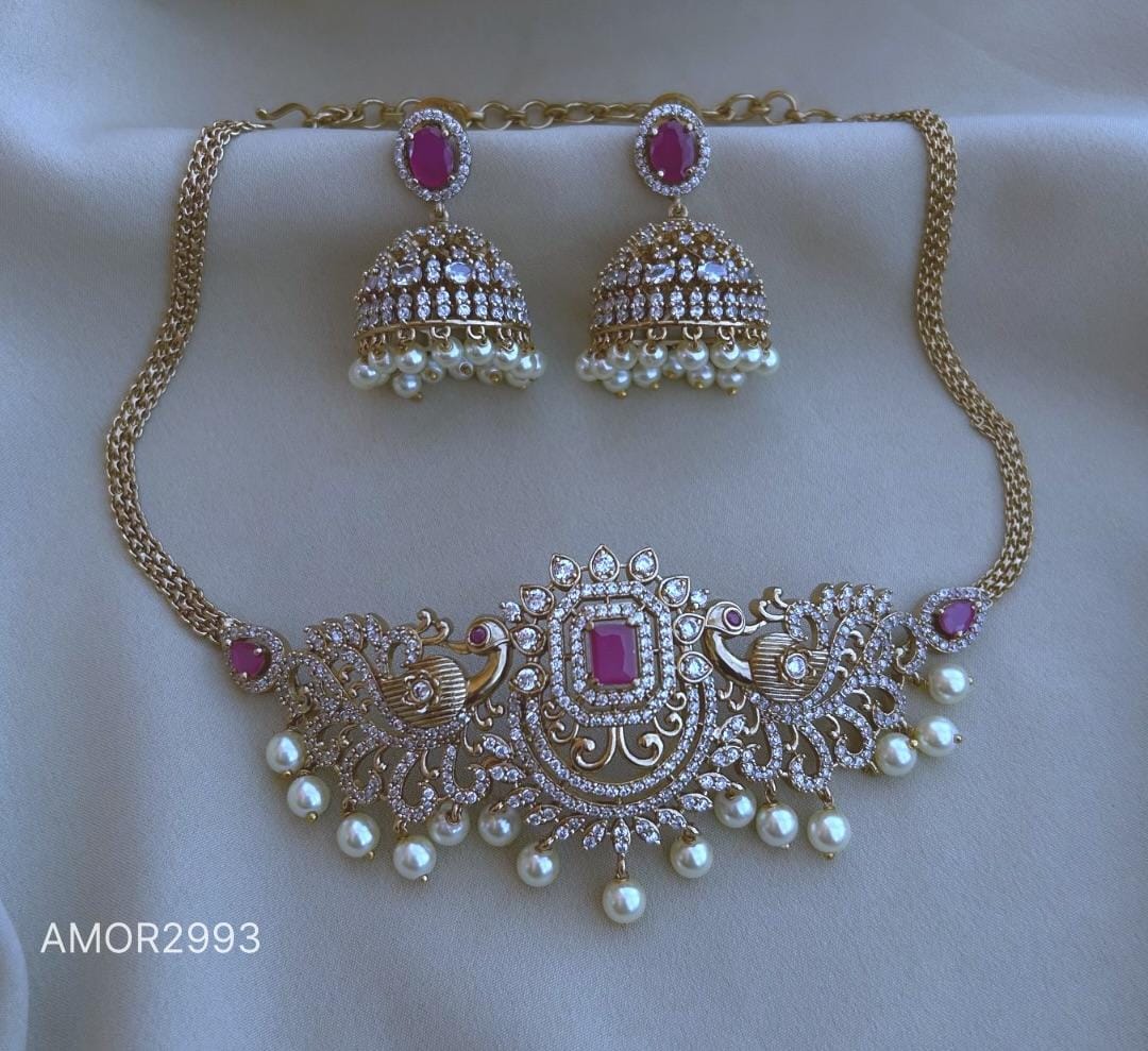 An elegant traditional jewellery set featuring a ruby-tone centerpiece, sparkling stones, and delicate pearl drops, paired with matching jhumka earrings—perfect for weddings and festive occasions.
