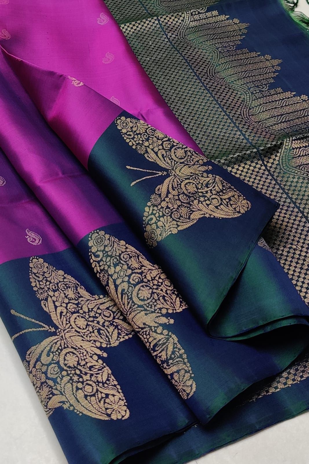 A Magenta and Navy Blue silk saree is a traditional Indian garment known for its luxurious fabric, rich texture, and elegant drape. Made from silk, a natural fiber, these sarees are a symbol of grace and are often worn for special occasions like weddings and festivals.