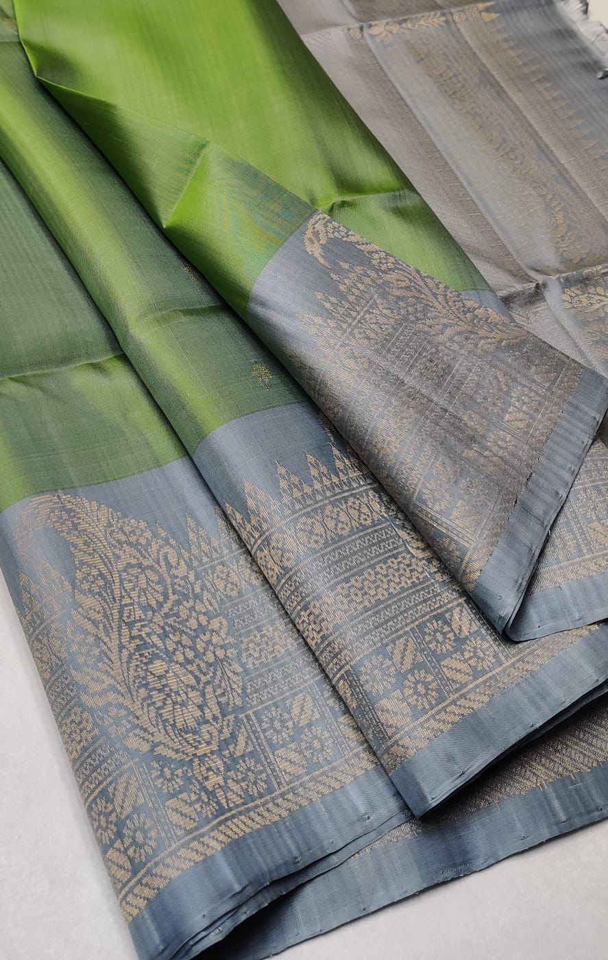 A Olive Green and Gray silk saree is a traditional Indian garment known for its luxurious fabric, rich texture, and elegant drape. Made from silk, a natural fiber, these sarees are a symbol of grace and are often worn for special occasions like weddings and festivals.