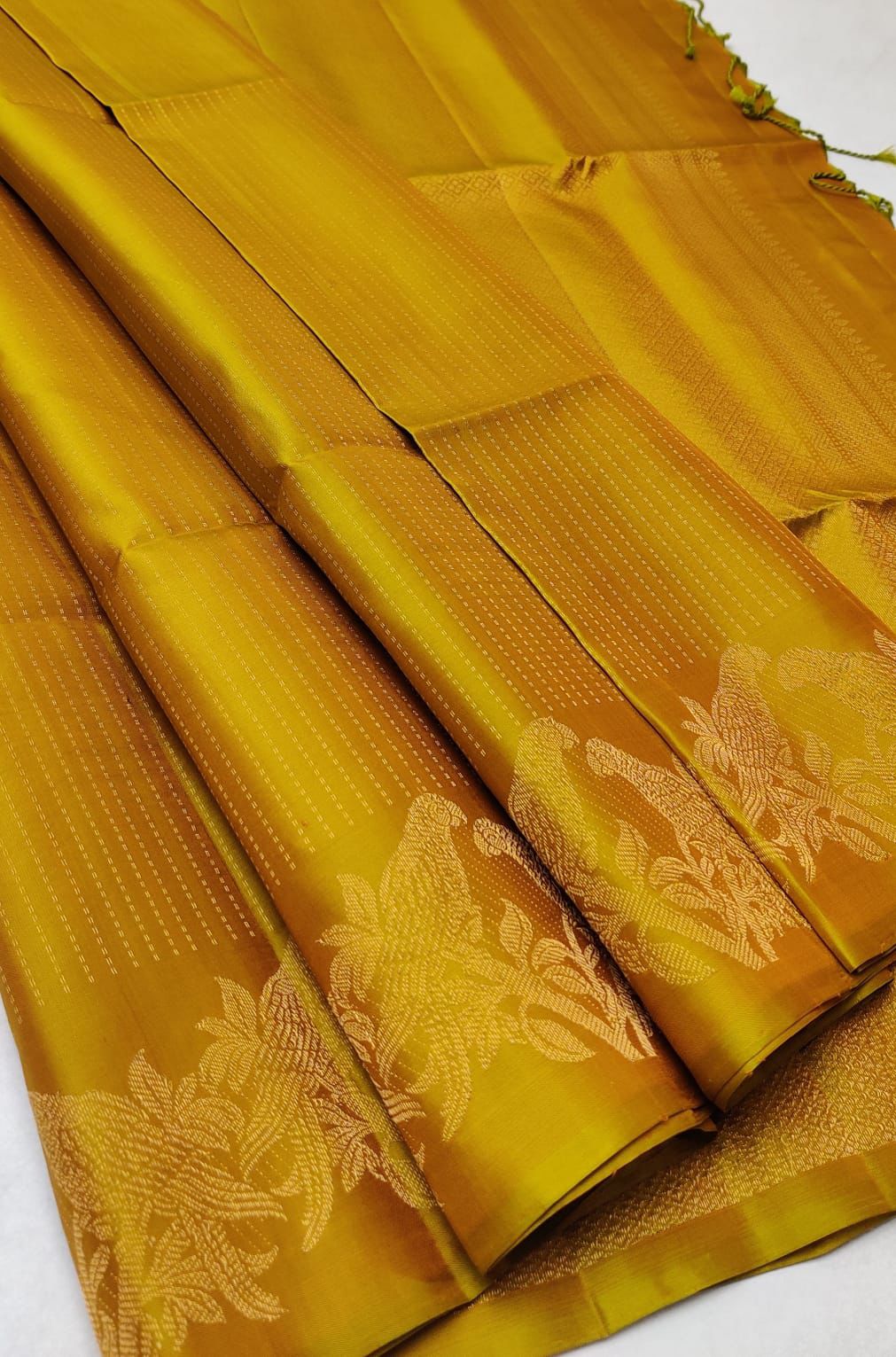 Elegant deep saree adorned with fine gold zari stripes and a richly woven traditional border, giving it a classic and graceful look.