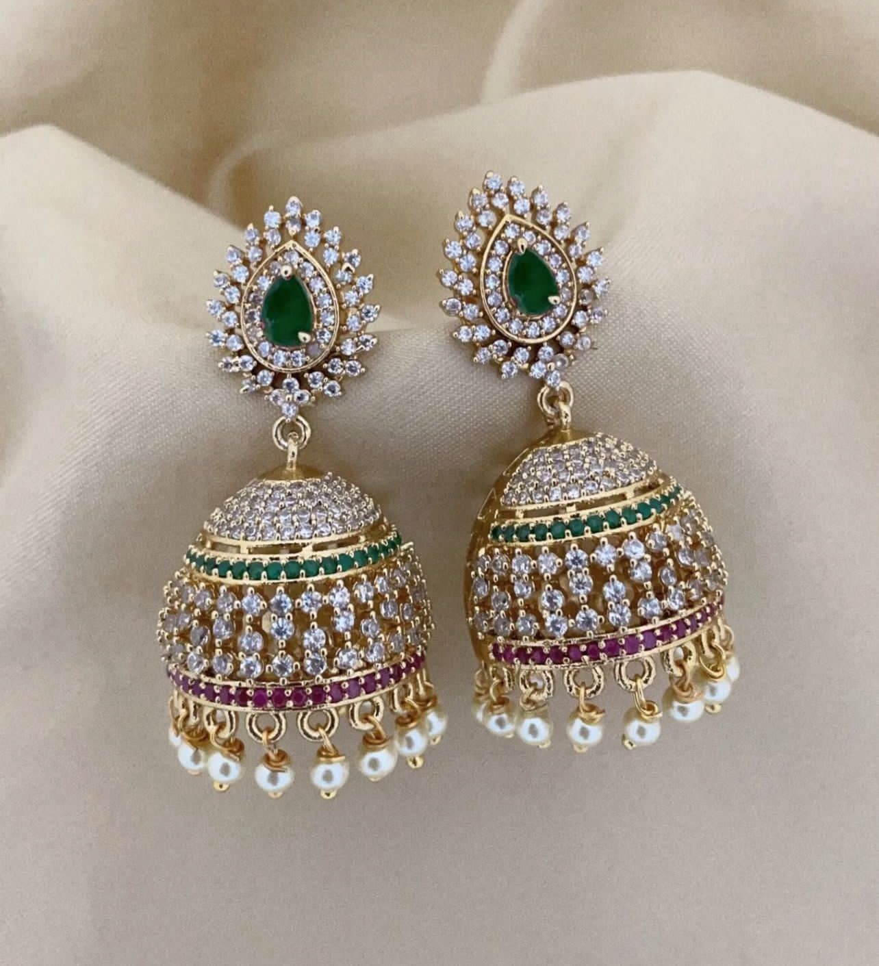 These elegant gold-tone jhumka earrings feature a teardrop emerald-green stone bordered with sparkling white stones, leading to a beautifully detailed dome design.
