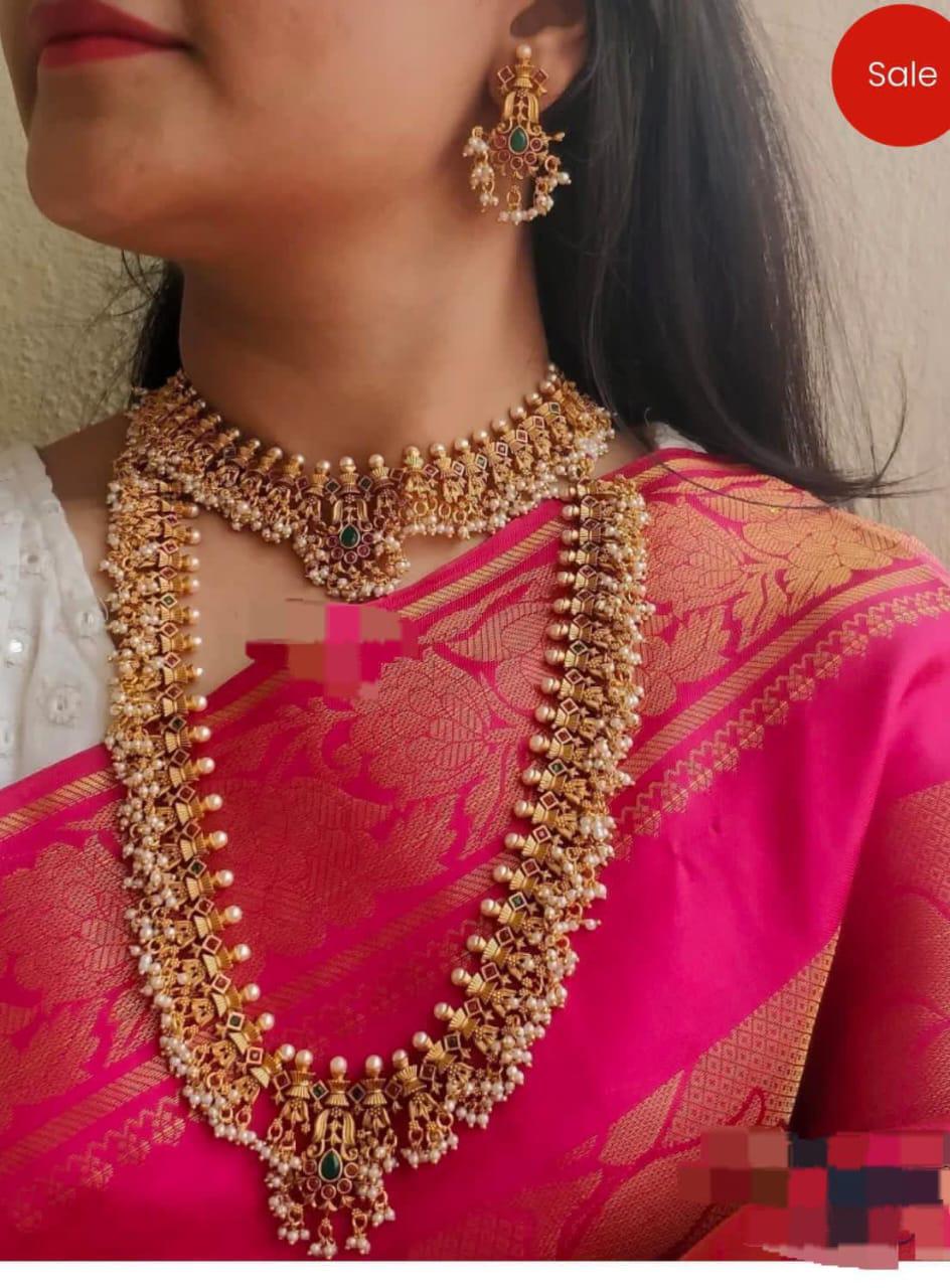 Traditional South Indian Kasu Haram jewellery set featuring a layered gold coin long necklace, matching choker, and elegant jhumka earrings. Intricately designed with temple motifs, pearls, and green stone accents, perfect for bridal and festive wear.