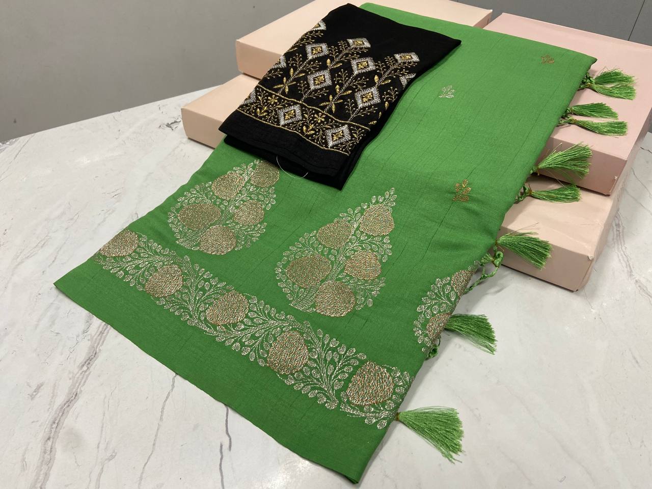 Elegant saree with subtle woven motifs and a rich sheen, paired with a contrasting embroidered blouse featuring intricate gold detailing. Finished with soft tassels, this saree offers a graceful blend of classic charm and contemporary elegance—perfect for festive and formal occasions.