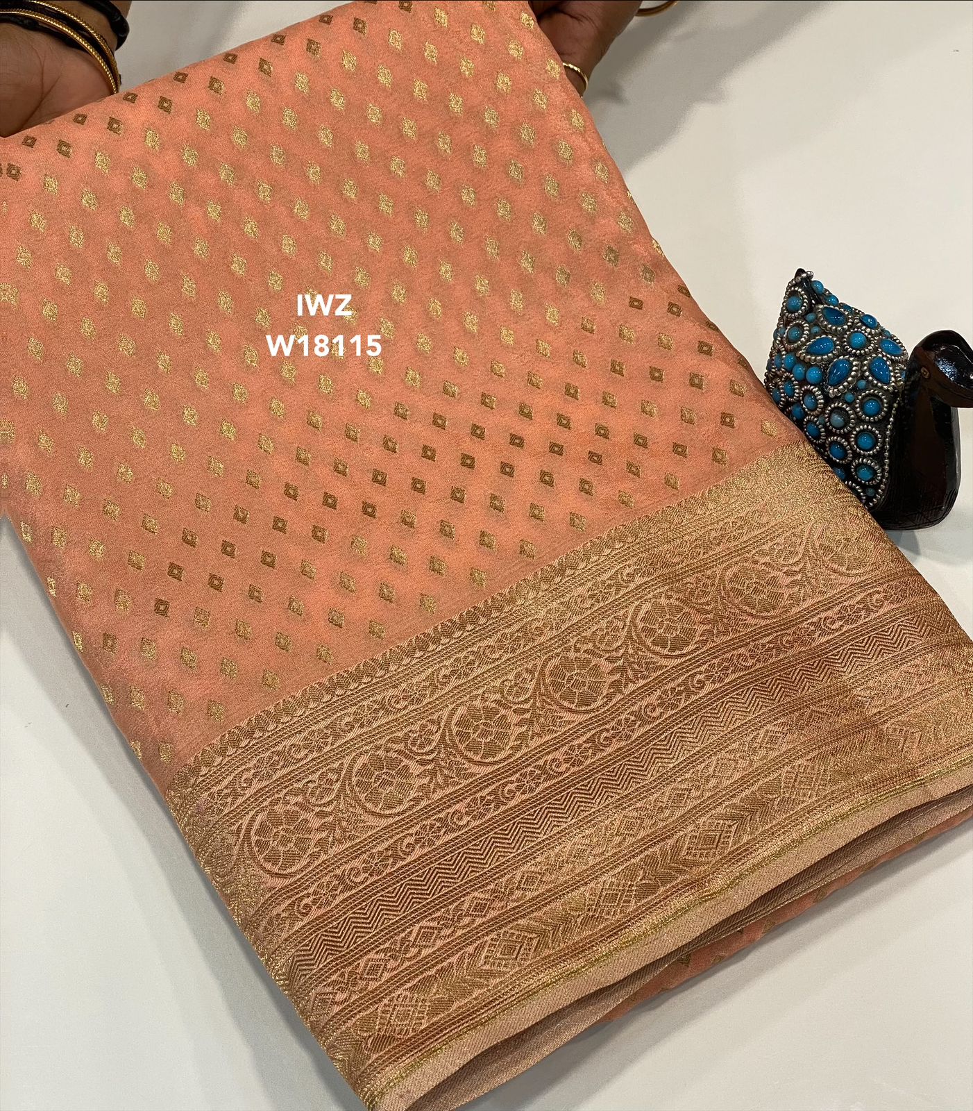 Elegant saree adorned with delicate gold zari butti and a richly woven traditional border, perfect for festive and formal occasions.